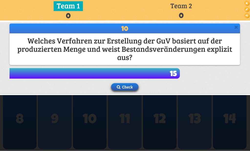Sobald das Quiz fertig ist werden die Studierenden in 2 bis 4 Teams eingeteilt und das Spiel kann beginnen. Die Namen der Teams können frei gewählt werden. Jedem Team. wird nun nacheinander eine Frage gestellt, wobei ein Zeitlimit für die Beantwortung eingestellt werden kann. Sobald sich die Gruppe auf eine Antwort geeinigt hat, spricht der Sprecher der Gruppe die Antwort laut aus. Der Lektor kann nun die richtige Antwort am Beamer einblenden. Sofern die Gruppe richtig geantwortet hat, erhält sie die zuvor eingestellten Punkte. Sofern die Gruppe keine oder aber eine falsche Antwort gegeben hat, erhält sie je nach Einstellung entweder nur keine Punkte oder aber sie verliert einige oder sogar alle Punkte. Gewonnen hat klarer Weise die Gruppe, die am Ende am meisten Punkte hat.