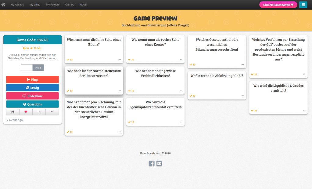 Man erstellt ein Quiz und befüllt dieses mit Fragen und entsprechenden Antworten. Jeder Frage kann außerdem ein Punktewert zugeteilt werden. In der kostenlosen Basisvariante von Baamboozle sind zwar keine Richtig/Falsch-Fragen oder MC-Fragen enthalten, allerdings kann man diese im verfügbaren offenen Fragetyp sehr leicht „nachbasteln“.