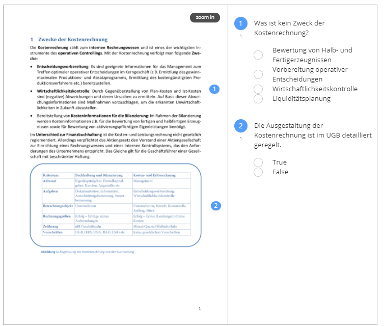 Nach Upload des Textes können Stellen auf dem Dokument angeklickt werden. An der entsprechenden Stelle wird dann eine Referenznummer eingefügt. Unter dieser Referenznummer kann man dann gleich rechts neben dem Dokument entweder ergänzende Materialien (z.B. Text, Bild, Video, Audio etc.) oder aber eine sich auf die entsprechende Textpassage beziehende Aufgabe einfügen. Die Aufgabe kann z.B. aus der Beantwortung einer Multiple-Choice-Frage, dem Verfassen eines Essays oder dem Anfertigung einer Zeichnung bestehen. Jeder Aufgabe kann ein Punktewert zugeteilt werden.