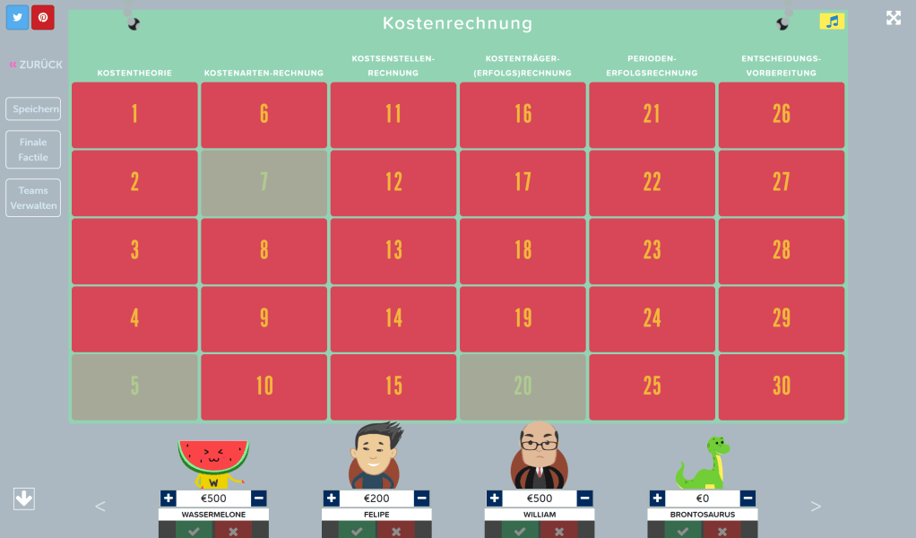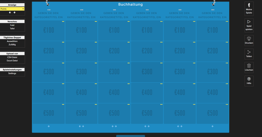 Es erscheint eine matrixförmige Spieltafel mit 6 Spalten und 5 Zeilen. Die Spalten repräsentieren die Themenkategorien, die Zeilen hingegen den Schwierigkeitsgrad der Fragen; für Fragen in der ersten Zeile erhält ein Team bei richtiger Antwort 100 Punkte, in der zweiten Zeile sind es dann 200 Punkte, in der dritten 300 Punkte usw. Sobald man ein Element in der Matrix anklickt, kann man eine dem Schwierigkeitsgrad entsprechende Frage samt Musterantwort eintragen. Die Fragen können auch in eine Excel-Vorlage eingetragen und auf Factile hochgeladen werden.