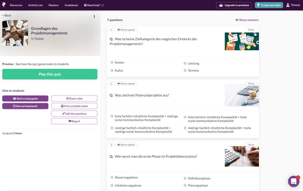 Das fertige Quiz wird dann in der Library des Users abgespeichert. Dort können auch PDF-Dokumente, Youtube-Videos, Weblinks sowie von anderen Usern erstellte Quizze abgelegt werden. Quizze können außerdem auch (mit oder ohne Lösung) ausgedruckt werden.