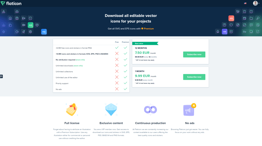 Wenn man sich auf Flaticon registriert, aber kein Premium-Abo erwirbt, kann man 3 Icon-Sammlungen mit 50 Icons pro Sammlung erstellen. Das Download-Limit liegt bei 100 Icons im PNG-Format pro Tag. In den Profildaten wird angegeben, wie stark man das tägliche Download-Limit bereits aufgebraucht hat. Möchte man diese Limits erweitern, muss man ein Premium-Abonnement käuflich erwerben.