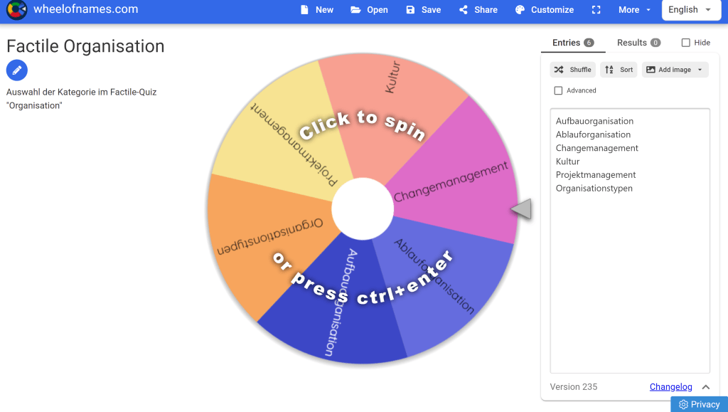 Nun tippt man einfach auf das Rad, um eine erste Zufallsauswahl zu starten. Nachdem ein Begriff ausgewählt wurde, scheint dieser in der rechts einblendbaren Ergebnisliste auf. Unmittelbar nach Vorliegen des Ergebnisses kann man angeben, ob das ausgewählte Element aus dem Zufallsrad entfernt werden soll (= Ziehen mit Zurücklegen) oder nicht (= Ziehen ohne Zurücklegen). Alle weiteren Zufallsauswahlen werden ebenfalls in die Ergebnisliste eingetragen. Die Ergebnisliste kann jederzeit mit nur einem Klick komplett gelöscht werden. Die Begriffs- bzw. Ergebnisliste kann jederzeit ausgeblendet werden; im Zuge einer Präsentation kann das Glücksrad auch als Vollbildanzeige dargestellt werden.