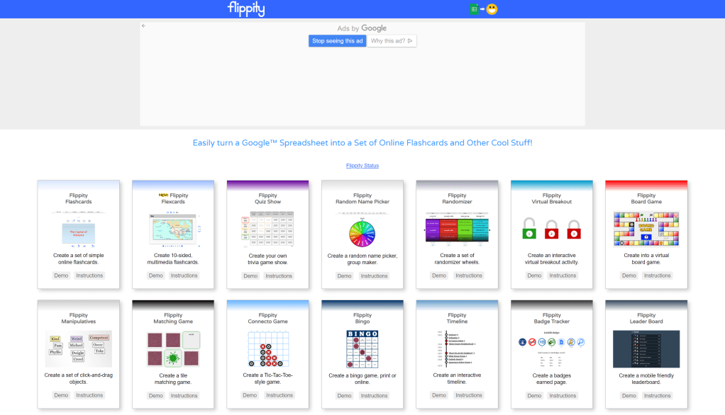 Nachdem man die Internetseite angesteuert hat, sieht man sofort, welche Lehr- und Lernmaterialien mit Flippity erstellt werden können. Bei jeder Option kann man sich zunächst eine Demo ansehen oder aber gleich angeleiteten Erstellung einer eigenen Version des jeweiligen Materials wechseln.