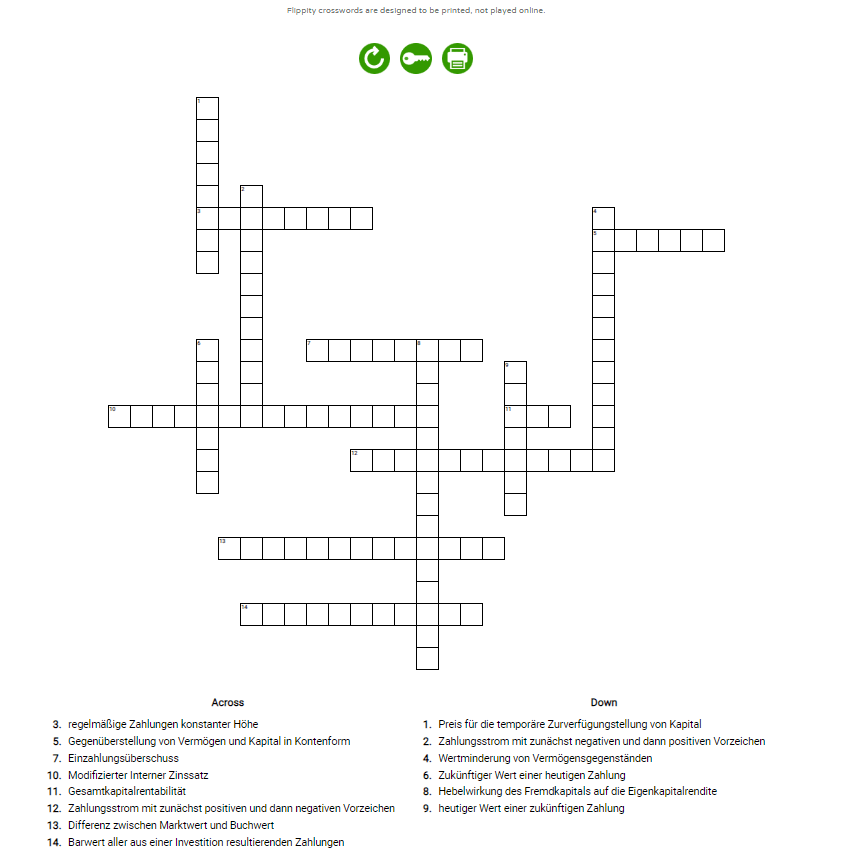 Mit Flippity lassen sich beispielsweise Kreuzworträtsel, Vier Gewinnt, Memory, Quizshows, Zufallsauswahlen, Wortwolken, Zeitleisten, Turnierraster, Leaderboards u.v.m. erstellen. Nachfolgend ist ein Beispiel für ein Kreuzworträtsel dargestellt.