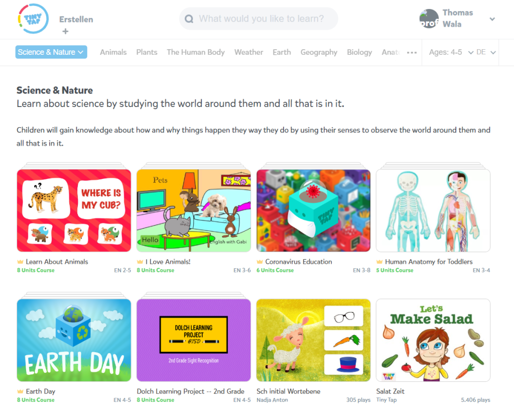 Hier noch ein kleines Beispiel für eine TinyTap-Lernstrecke: