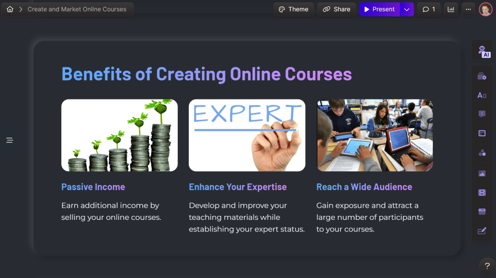 Ist man mit der Präsentation schließlich zufrieden, kann man sie im Präsentationsmodus öffnen und dort mit den Pfeiltasten von einer Folie zur nächsten klicken. Weiters kann man die Präsentation mit anderen Personen über deren E-Mail-Adressen oder über einen Internetlink teilen und sich in der Folge anzeigen lassen, wie viele Personen sich die Präsentation tatsächlich angesehen haben. Schließlich kann eine Präsentation auch als PDF- oder Power-Point-Dokument heruntergeladen werden.
